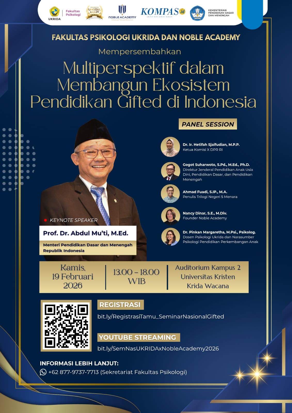 Fakultas Psikologi Universitas Kristen Krida Wacana (UKRIDA) bersama Noble Academy dan Kompas Grup dengan hormat mengundang Bapak/Ibu untuk berkenan hadir dalam Seminar Nasional bertema:
