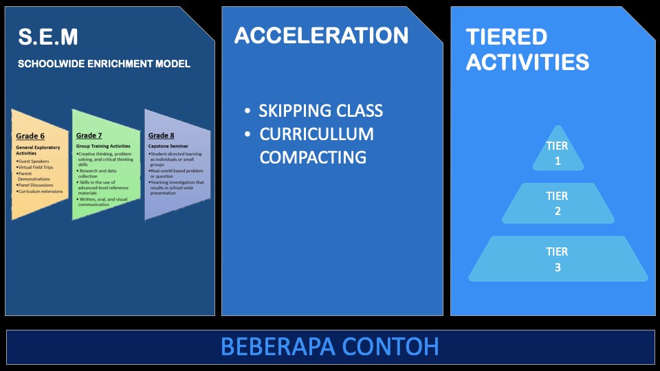 Diferensiasi adalah respon terhadap kebutuhan belajar siswa yang berdasarkan : minat, profil belajar dan kesiapan siswa. Beberapa contoh dan pendekatan yang dipakai untuk diferensiasi adalah : Schoolwide Enrichment Model (SEM), Akselerasi (baik dengan cara Lompat Kelas atau dengan Pemadatan Kurikulum), Tier Activity (aktivitas berjenjang), metode KUD (Know, Understand. Do), Kontrak Belajar dan Kelompok Belajar.